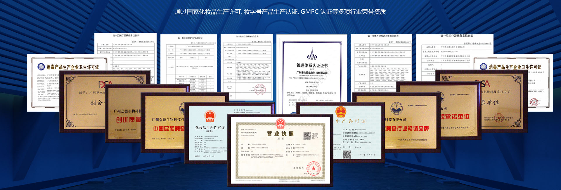 通這國家化妝品生產(chǎn)許可,妝字號(hào),消字號(hào),械字號(hào),粉單元產(chǎn)品生產(chǎn)許可證產(chǎn)品生產(chǎn)認(rèn)證,GMPC認(rèn)證等多項(xiàng)行業(yè)榮譽(yù)資質(zhì)